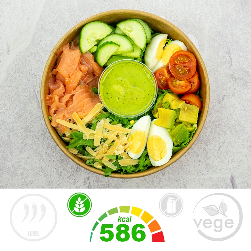 Składniki: Wędzony łosoś na zimno 19% (ŁOSOŚ wędzony (ŁOSOŚ, sól) 100%), Ogórek 16,2% , Pomidorki cherry 13,4%, Mix sałat 13,4% (mix sałat (rukola, cykoria escarola, endywia frisee, radicchio) 100%), Awokado 13,4%, Jajka 12,1% (JAJA gotowane 100%), Sos ziołowy 9,7% (oliwa z oliwek 51,7%, woda 13,3%, ocet winny 13,3%, musztarda (woda, ocet spirytusowy, GORCZYCA biała, GORCZYCA czarna, cukier, sól, przyprawy, barwnik: kurkumina) 10%, czosnek 3,3%, bazylia 1,7%, szczypiorek 1,7%, natka pietruszki 1,7%, miód 1,7%, koper włoski świeży 1,7%), Rukola 2,7%