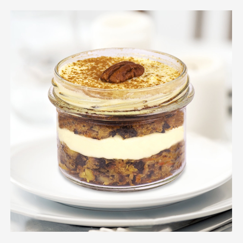 Miękka, gęsta i wilgotna konsystencja ciasta ubogaconego bakaliami z owoców suszonych i orzechów włoskich. Całość przyprawiona korzennym charakterem cynamonu, goździka, gałki muszkatałowej i kardamonu. Deser wykończony warstwą kremowego serka oraz udekorowana orzechem pekan.
