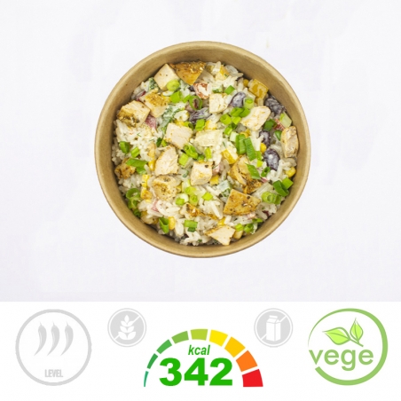 Składniki: Sałatka Ryżowa (Ryż Biały, Kukurydza (Konserwowa) (Kukurydza, Woda, Sól), Fasola Czerwona (Konserwowa) (Fasola Czerwona, Woda, Sól), Majonez Domowy (Olej Rzepakowy, Pasteryzowane Żółtka JAJ, Musztarda), Papryka Czerwona, Papryka Zielona, Papryka Żółta, Koper Ogrodowy, Pieprz Czarny, Sól, Woda) (74%), Kurczak do Sałatek i Zup (Filet z Piersi Kurczaka, Olej Rzepakowy, Papryka Słodka, Majeranek, Czosnek, Curry, Pieprz Czarny, Sól) (14%), Ananas (12%) Szczypiorek